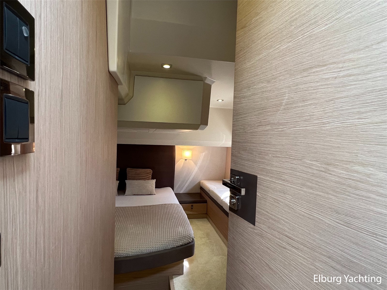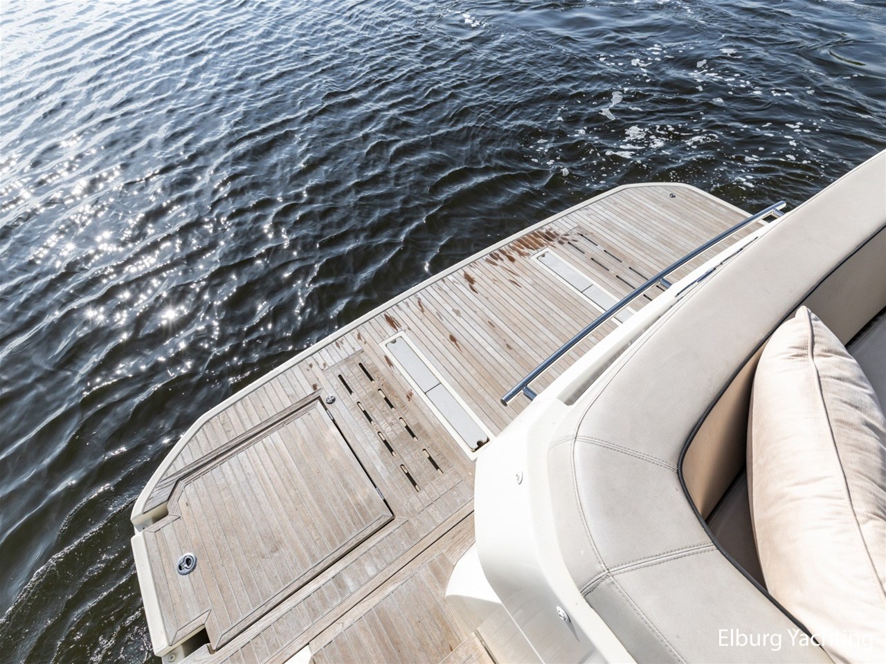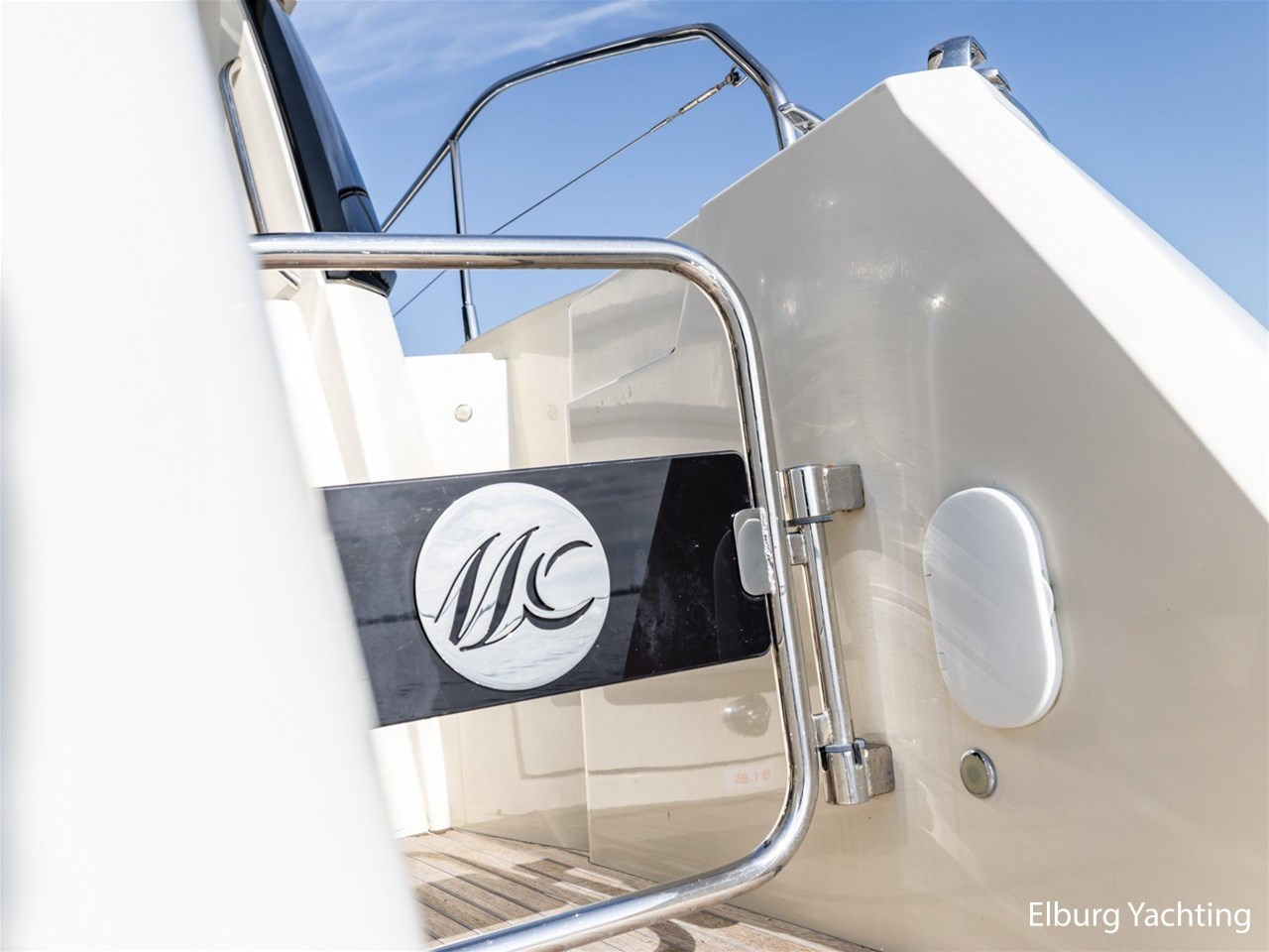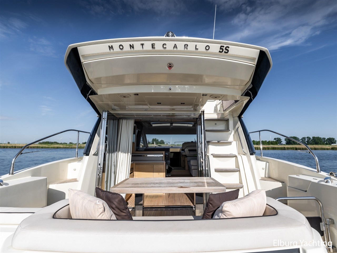 Zeer compleet uitgevoerde Monte Carlo 5S. De 5S-serie onderscheidt zich door stoere en sportieve looks en een hardtop met een buitenlounge op het dak. Vanaf het hydraulisch beweegbare zwemplateau wordt de open kuip betreden. De kuip heeft een geïntegreerde bank met bijbehorende kussens en vaste tafel. Aan SB zijde in de kuip bevindt zich de toegang tot de extra hut (crew cabin) in het achterschip, deze hut is tevens te gebruiken als extra opbergruimte. Via de open kuip stap je eenvoudig op naar het gangboord met goede houvast rondom voor een veilige loop over het dek. Op het voordek zijn twee geïntegreerde klapbare zonnebedden aanwezig. Via een geïntegreerde trap vanuit de kuip betreed je de buitenlounge op het dak. Deze buitenlounge heeft een in hoogte verstelbare tafel waarmee er ook een groot zonnebed gecreëerd kan worden. De salon en de kuip laten zich verbinden door drie grote glazen wegklapbare deuren. De kombuis is gesitueerd bij de ingang van de salon. Door het openen van de salondeuren wordt de kombuis volledig betrokken bij de kuip. De salon gecombineerd met de stuurstand bevindt zich op dekniveau. Via de de grote ramen rondom (getint) is er goed zicht en komt er veel licht binnen. Het buitengevoel naar binnen brengen kan door het openen van het grote elektrisch bedienbare schuifdak en twee zijruiten. Benedendeks bevinden zich drie hutten voor in totaal zes personen. De 2-persoons eigenaarshut bevindt zich midscheeps over de volledige breedte van het schip. Deze hut is voorzien van eigen sanitair en-suite. Aan stuurboordzijde bevindt zich een 1 x 2 persoons stapelbed en in de voorhut een 2-persoons Frans bed. Centraal is er een tweede badkamer met douche en toilet gesitueerd. Deze Monte Carlo 5S is verder voorzien van: achteruitkijk camera via plotterscherm, elektrisch bedienbare gangway, kuip afsluitbaar met deur naar zwemplateau, TV op lift in salon, Volvo ship/motormanagement display bij stuurstand, Fusion audiosysteem, trimtabs, Yachtcontroller afstandsbediening om te manoeuvreren middels de IPS aandrijving + boegschroef.