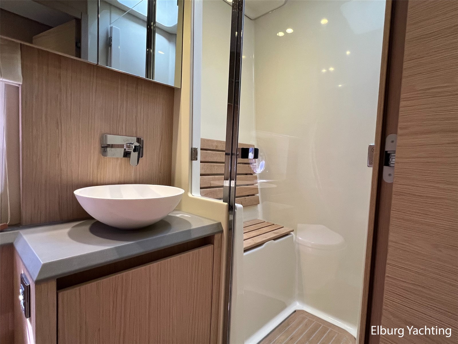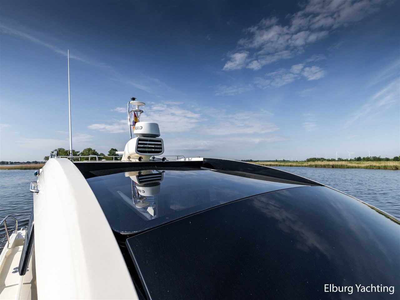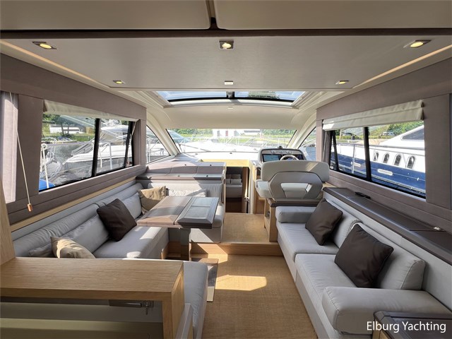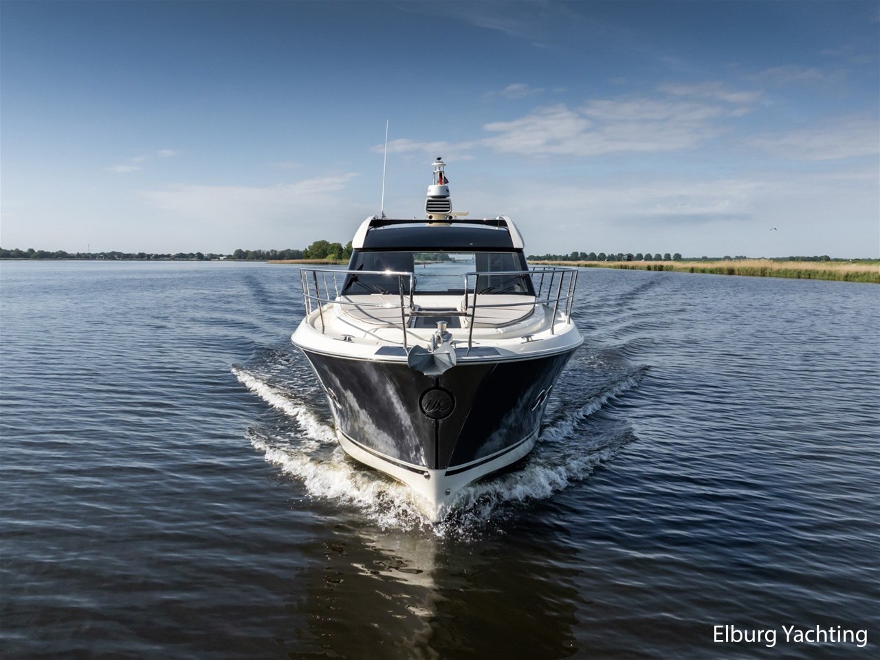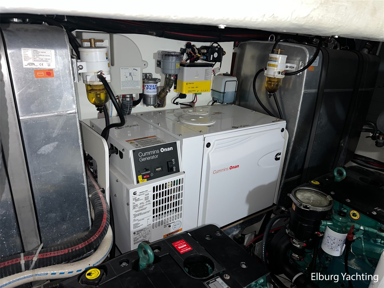 Zeer compleet uitgevoerde Monte Carlo 5S. De 5S-serie onderscheidt zich door stoere en sportieve looks en een hardtop met een buitenlounge op het dak. Vanaf het hydraulisch beweegbare zwemplateau wordt de open kuip betreden. De kuip heeft een geïntegreerde bank met bijbehorende kussens en vaste tafel. Aan SB zijde in de kuip bevindt zich de toegang tot de extra hut (crew cabin) in het achterschip, deze hut is tevens te gebruiken als extra opbergruimte. Via de open kuip stap je eenvoudig op naar het gangboord met goede houvast rondom voor een veilige loop over het dek. Op het voordek zijn twee geïntegreerde klapbare zonnebedden aanwezig. Via een geïntegreerde trap vanuit de kuip betreed je de buitenlounge op het dak. Deze buitenlounge heeft een in hoogte verstelbare tafel waarmee er ook een groot zonnebed gecreëerd kan worden. De salon en de kuip laten zich verbinden door drie grote glazen wegklapbare deuren. De kombuis is gesitueerd bij de ingang van de salon. Door het openen van de salondeuren wordt de kombuis volledig betrokken bij de kuip. De salon gecombineerd met de stuurstand bevindt zich op dekniveau. Via de de grote ramen rondom (getint) is er goed zicht en komt er veel licht binnen. Het buitengevoel naar binnen brengen kan door het openen van het grote elektrisch bedienbare schuifdak en twee zijruiten. Benedendeks bevinden zich drie hutten voor in totaal zes personen. De 2-persoons eigenaarshut bevindt zich midscheeps over de volledige breedte van het schip. Deze hut is voorzien van eigen sanitair en-suite. Aan stuurboordzijde bevindt zich een 1 x 2 persoons stapelbed en in de voorhut een 2-persoons Frans bed. Centraal is er een tweede badkamer met douche en toilet gesitueerd. Deze Monte Carlo 5S is verder voorzien van: achteruitkijk camera via plotterscherm, elektrisch bedienbare gangway, kuip afsluitbaar met deur naar zwemplateau, TV op lift in salon, Volvo ship/motormanagement display bij stuurstand, Fusion audiosysteem, trimtabs, Yachtcontroller afstandsbediening om te manoeuvreren middels de IPS aandrijving + boegschroef.