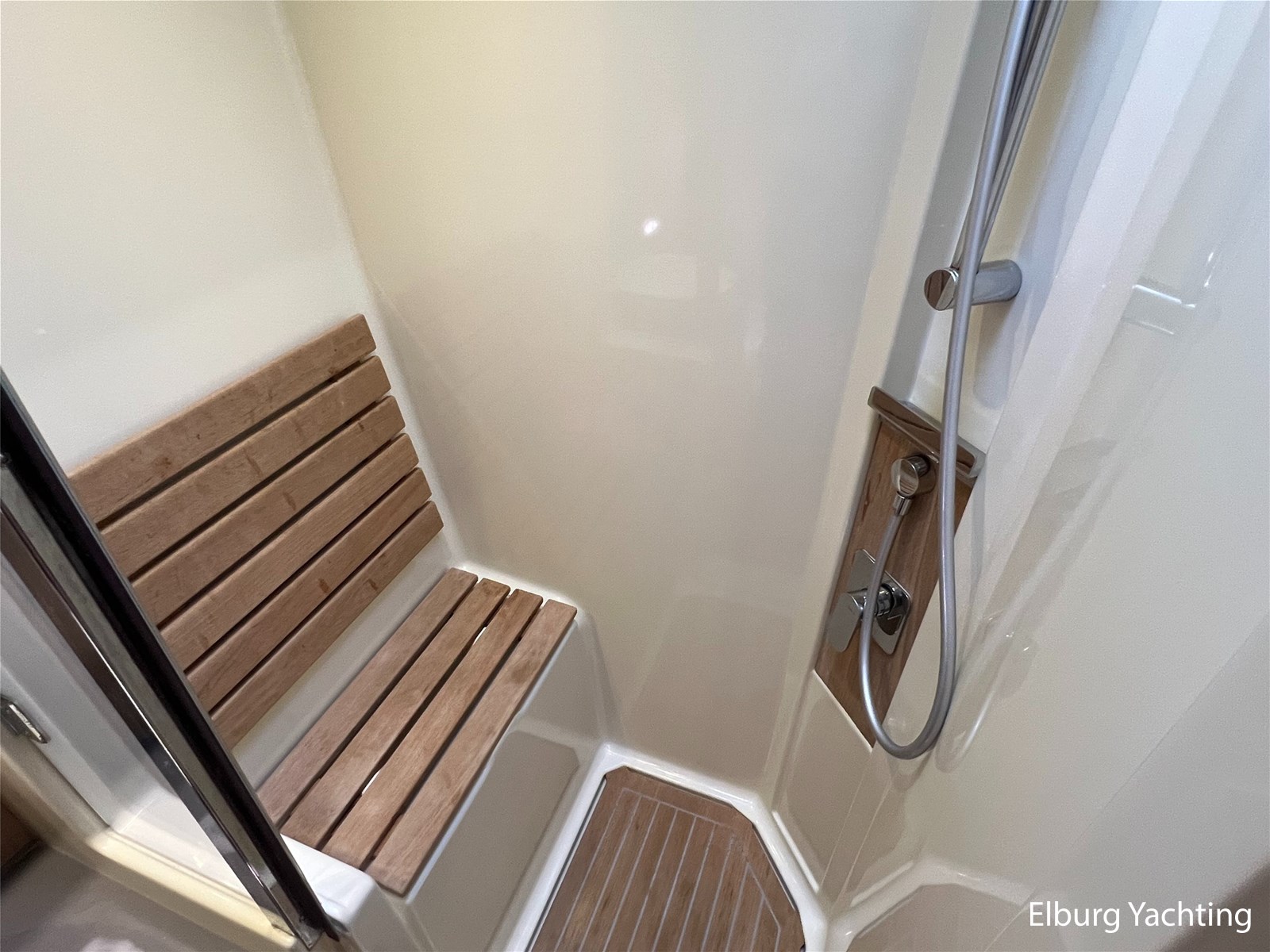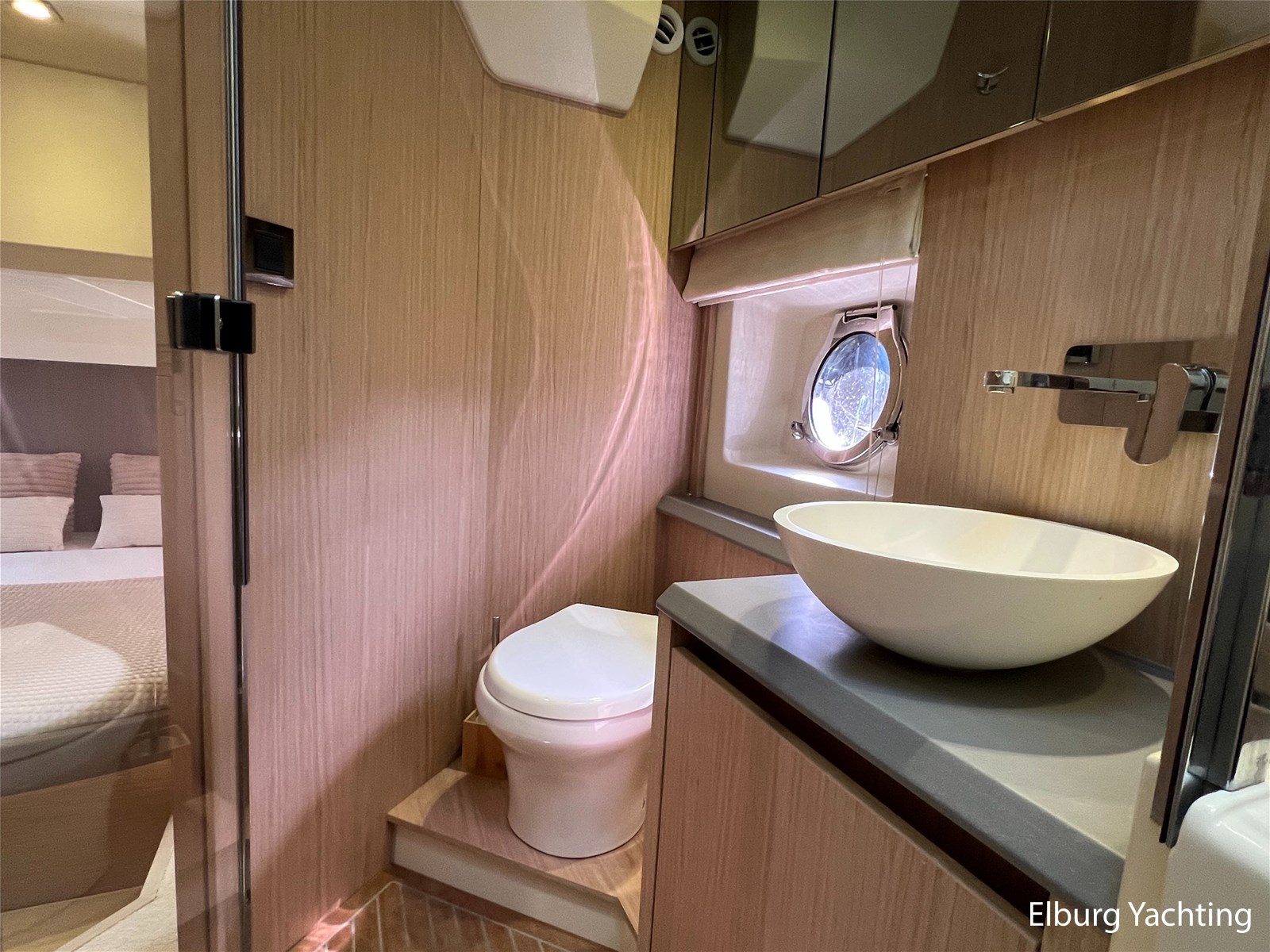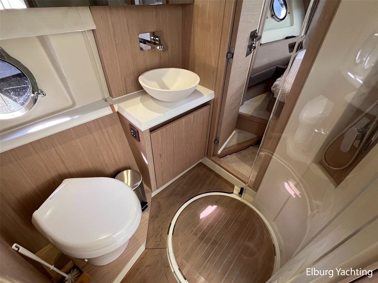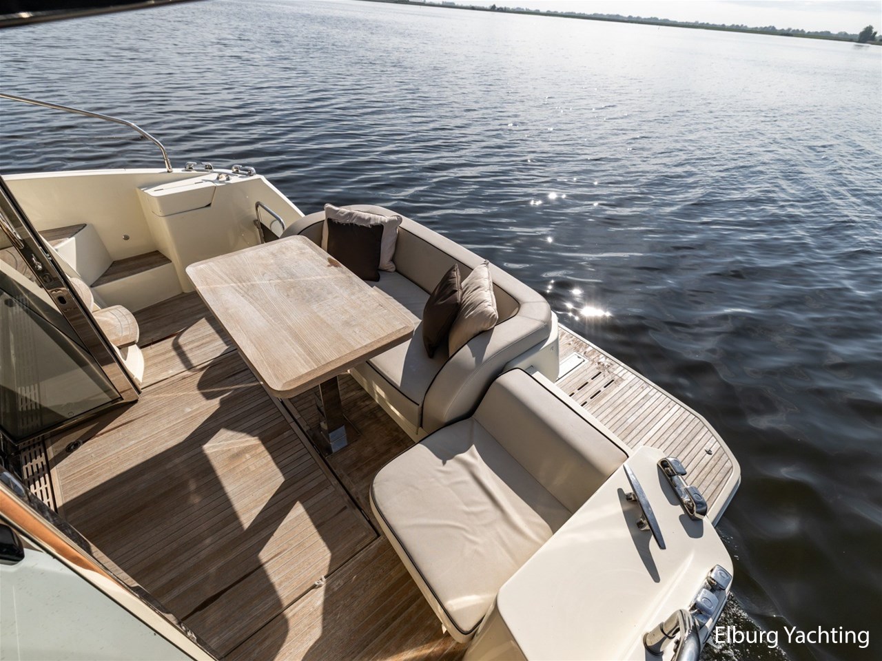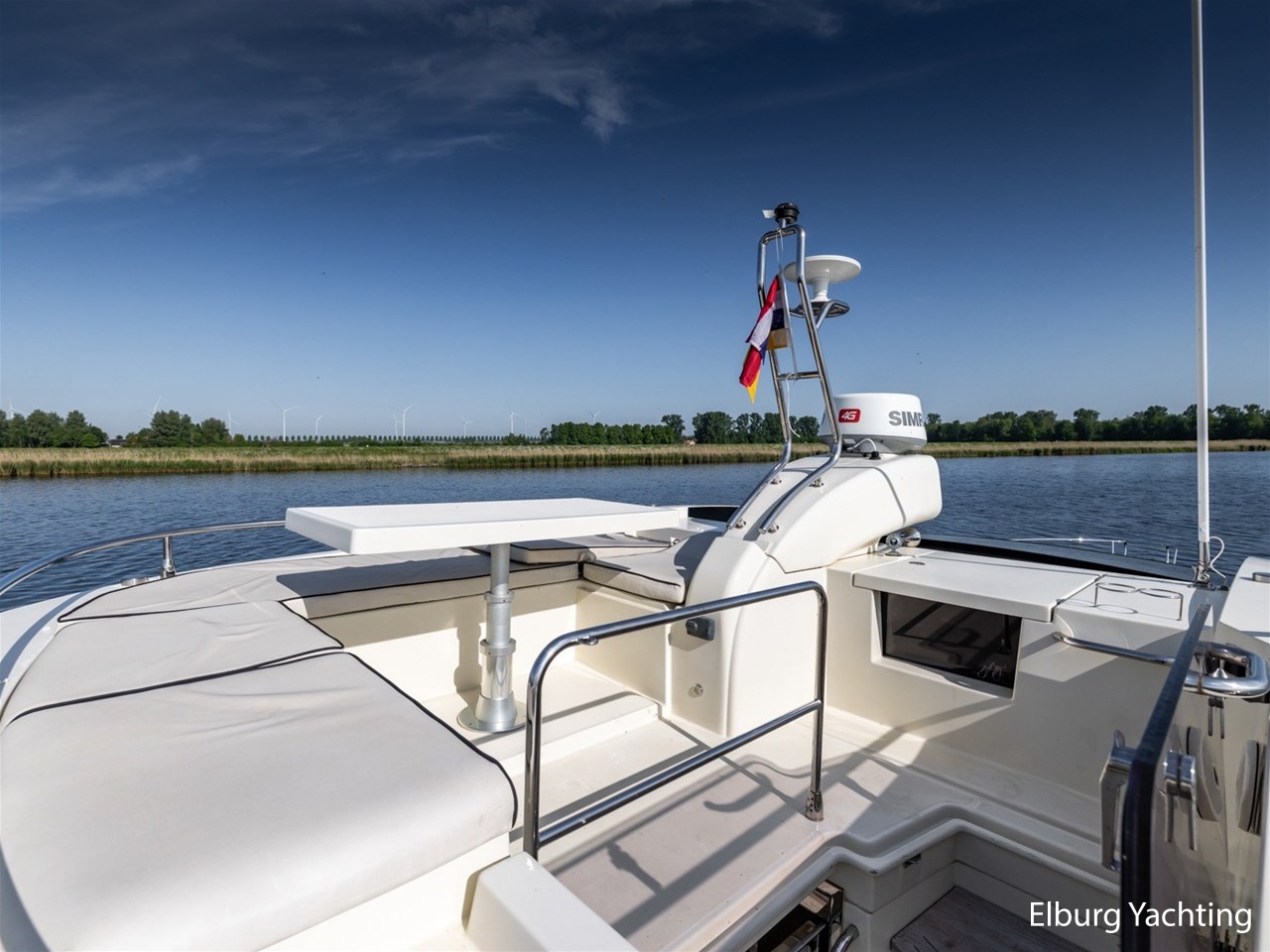 Zeer compleet uitgevoerde Monte Carlo 5S. De 5S-serie onderscheidt zich door stoere en sportieve looks en een hardtop met een buitenlounge op het dak. Vanaf het hydraulisch beweegbare zwemplateau wordt de open kuip betreden. De kuip heeft een geïntegreerde bank met bijbehorende kussens en vaste tafel. Aan SB zijde in de kuip bevindt zich de toegang tot de extra hut (crew cabin) in het achterschip, deze hut is tevens te gebruiken als extra opbergruimte. Via de open kuip stap je eenvoudig op naar het gangboord met goede houvast rondom voor een veilige loop over het dek. Op het voordek zijn twee geïntegreerde klapbare zonnebedden aanwezig. Via een geïntegreerde trap vanuit de kuip betreed je de buitenlounge op het dak. Deze buitenlounge heeft een in hoogte verstelbare tafel waarmee er ook een groot zonnebed gecreëerd kan worden. De salon en de kuip laten zich verbinden door drie grote glazen wegklapbare deuren. De kombuis is gesitueerd bij de ingang van de salon. Door het openen van de salondeuren wordt de kombuis volledig betrokken bij de kuip. De salon gecombineerd met de stuurstand bevindt zich op dekniveau. Via de de grote ramen rondom (getint) is er goed zicht en komt er veel licht binnen. Het buitengevoel naar binnen brengen kan door het openen van het grote elektrisch bedienbare schuifdak en twee zijruiten. Benedendeks bevinden zich drie hutten voor in totaal zes personen. De 2-persoons eigenaarshut bevindt zich midscheeps over de volledige breedte van het schip. Deze hut is voorzien van eigen sanitair en-suite. Aan stuurboordzijde bevindt zich een 1 x 2 persoons stapelbed en in de voorhut een 2-persoons Frans bed. Centraal is er een tweede badkamer met douche en toilet gesitueerd. Deze Monte Carlo 5S is verder voorzien van: achteruitkijk camera via plotterscherm, elektrisch bedienbare gangway, kuip afsluitbaar met deur naar zwemplateau, TV op lift in salon, Volvo ship/motormanagement display bij stuurstand, Fusion audiosysteem, trimtabs, Yachtcontroller afstandsbediening om te manoeuvreren middels de IPS aandrijving + boegschroef.