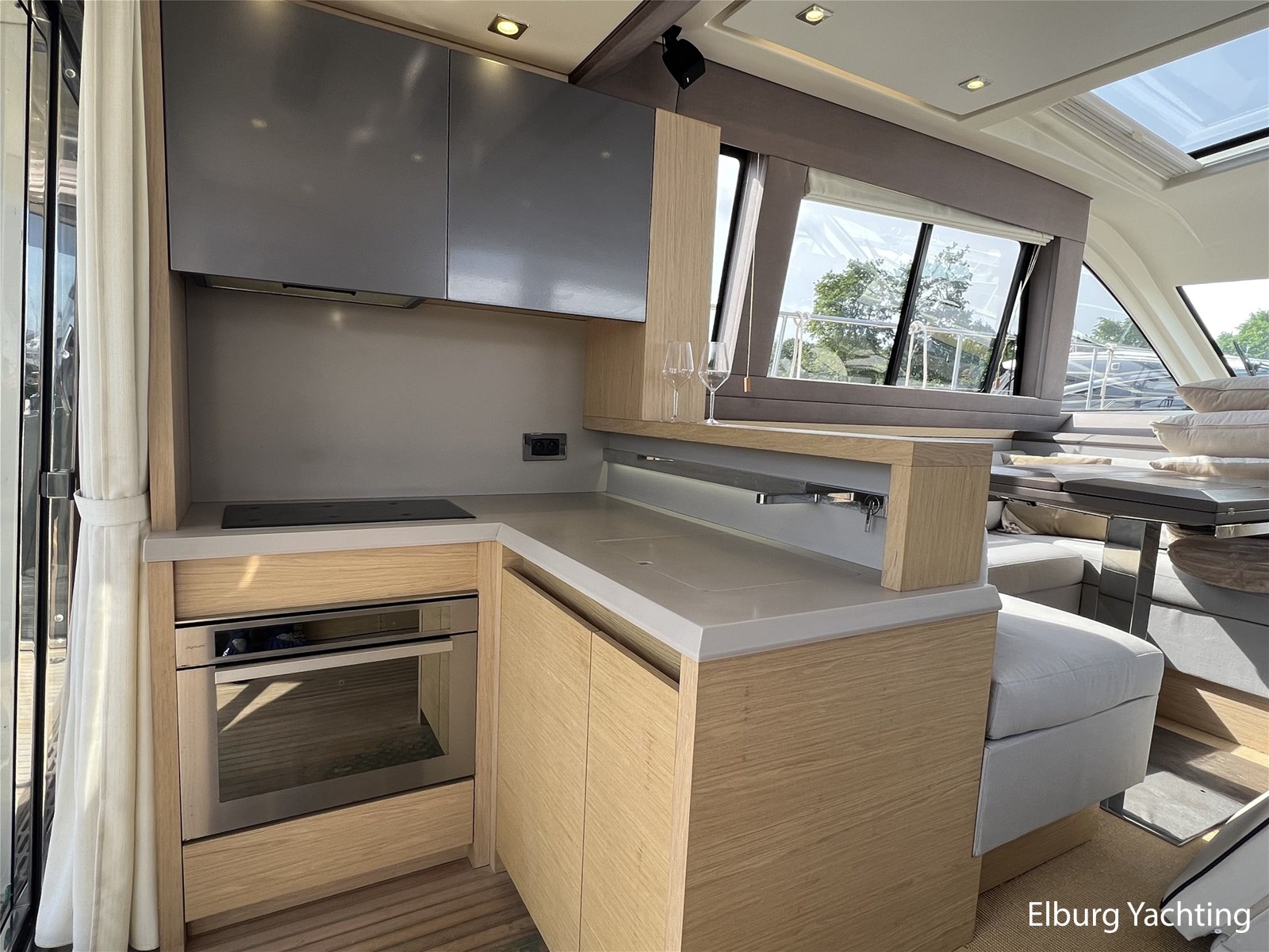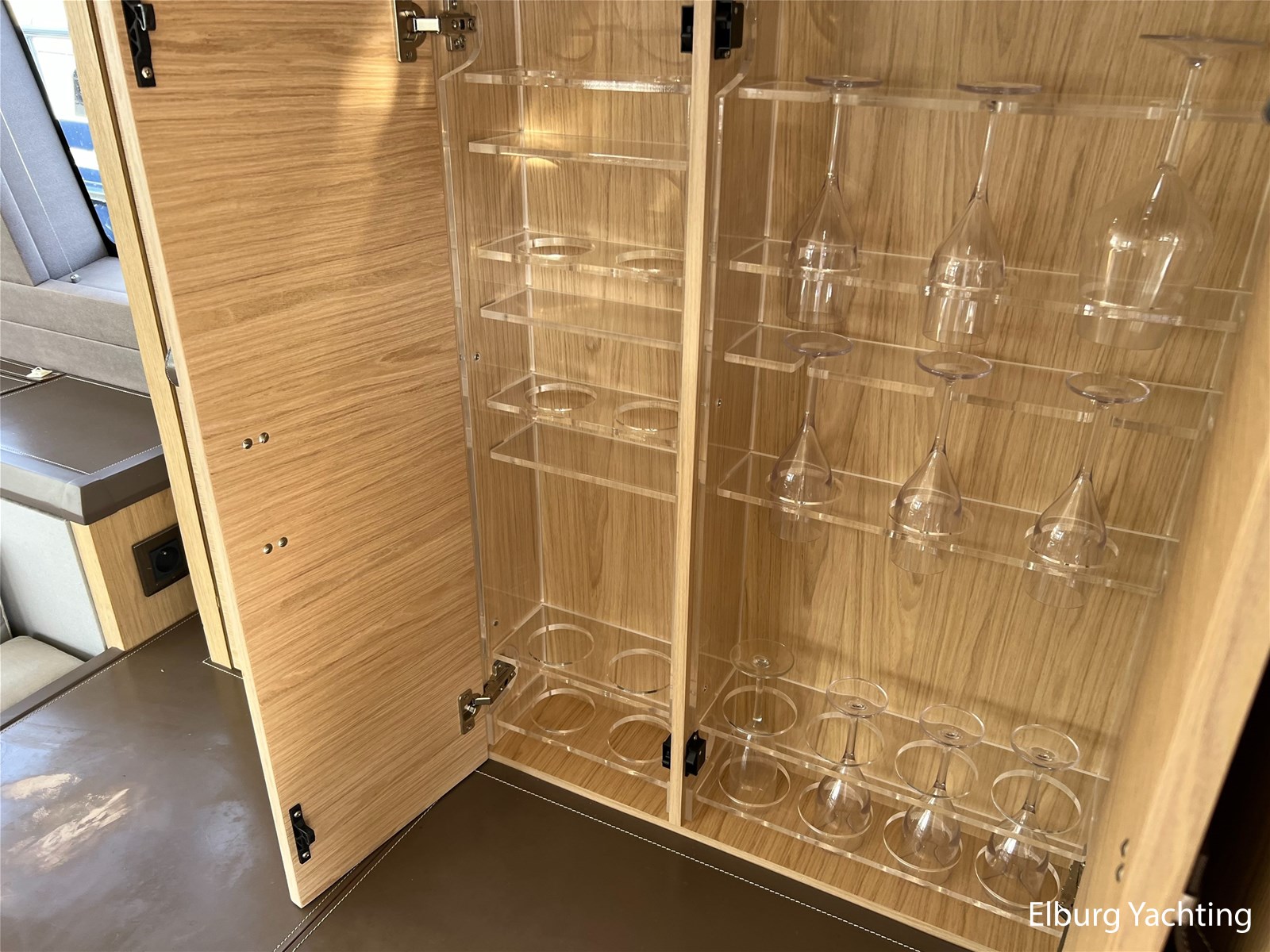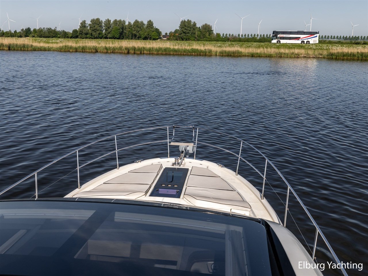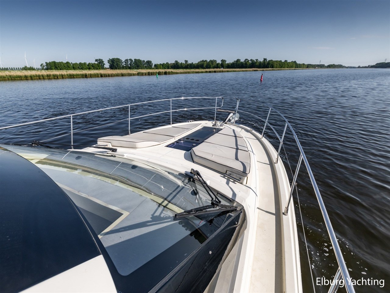 Zeer compleet uitgevoerde Monte Carlo 5S. De 5S-serie onderscheidt zich door stoere en sportieve looks en een hardtop met een buitenlounge op het dak. Vanaf het hydraulisch beweegbare zwemplateau wordt de open kuip betreden. De kuip heeft een geïntegreerde bank met bijbehorende kussens en vaste tafel. Aan SB zijde in de kuip bevindt zich de toegang tot de extra hut (crew cabin) in het achterschip, deze hut is tevens te gebruiken als extra opbergruimte. Via de open kuip stap je eenvoudig op naar het gangboord met goede houvast rondom voor een veilige loop over het dek. Op het voordek zijn twee geïntegreerde klapbare zonnebedden aanwezig. Via een geïntegreerde trap vanuit de kuip betreed je de buitenlounge op het dak. Deze buitenlounge heeft een in hoogte verstelbare tafel waarmee er ook een groot zonnebed gecreëerd kan worden. De salon en de kuip laten zich verbinden door drie grote glazen wegklapbare deuren. De kombuis is gesitueerd bij de ingang van de salon. Door het openen van de salondeuren wordt de kombuis volledig betrokken bij de kuip. De salon gecombineerd met de stuurstand bevindt zich op dekniveau. Via de de grote ramen rondom (getint) is er goed zicht en komt er veel licht binnen. Het buitengevoel naar binnen brengen kan door het openen van het grote elektrisch bedienbare schuifdak en twee zijruiten. Benedendeks bevinden zich drie hutten voor in totaal zes personen. De 2-persoons eigenaarshut bevindt zich midscheeps over de volledige breedte van het schip. Deze hut is voorzien van eigen sanitair en-suite. Aan stuurboordzijde bevindt zich een 1 x 2 persoons stapelbed en in de voorhut een 2-persoons Frans bed. Centraal is er een tweede badkamer met douche en toilet gesitueerd. Deze Monte Carlo 5S is verder voorzien van: achteruitkijk camera via plotterscherm, elektrisch bedienbare gangway, kuip afsluitbaar met deur naar zwemplateau, TV op lift in salon, Volvo ship/motormanagement display bij stuurstand, Fusion audiosysteem, trimtabs, Yachtcontroller afstandsbediening om te manoeuvreren middels de IPS aandrijving + boegschroef.
