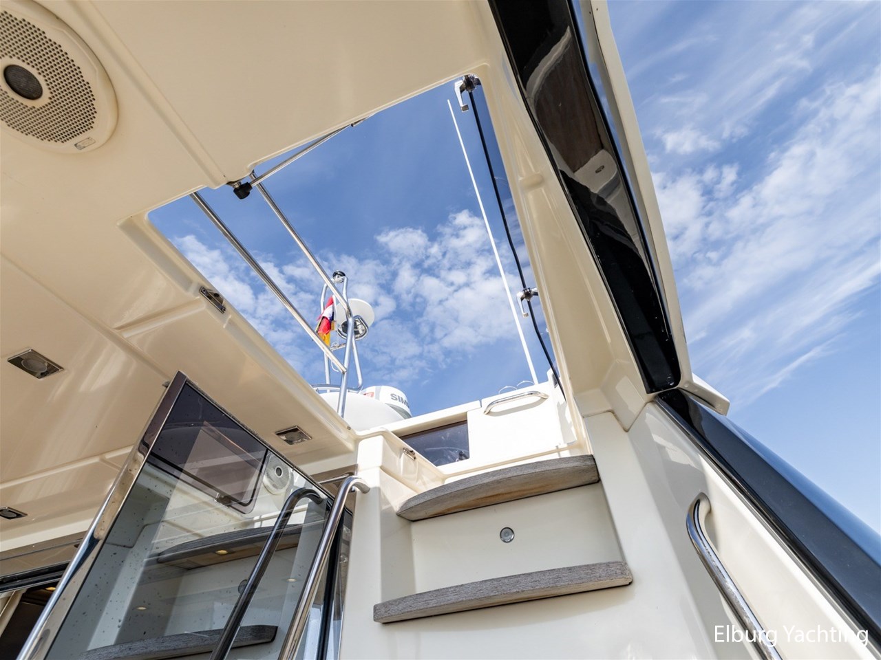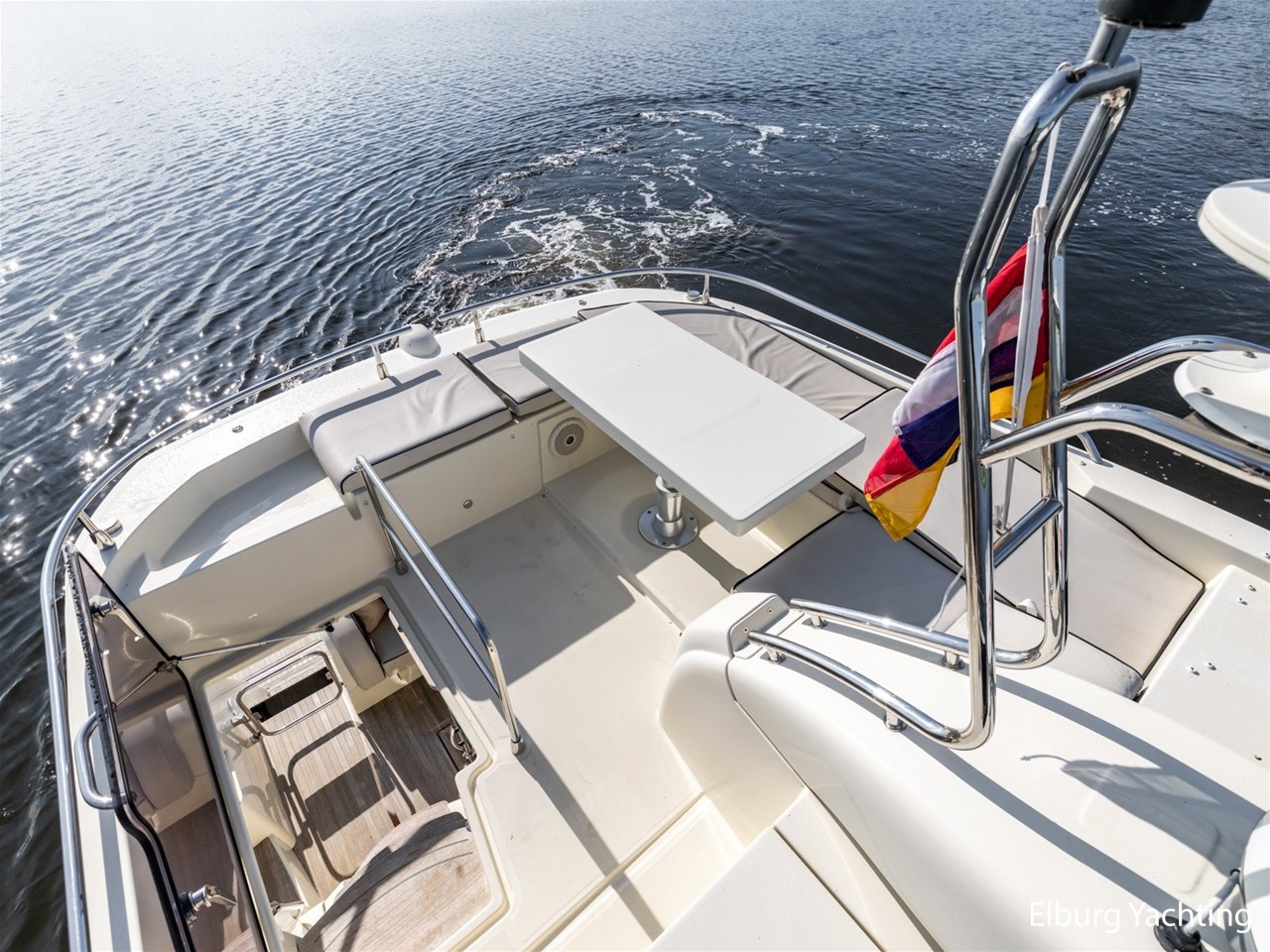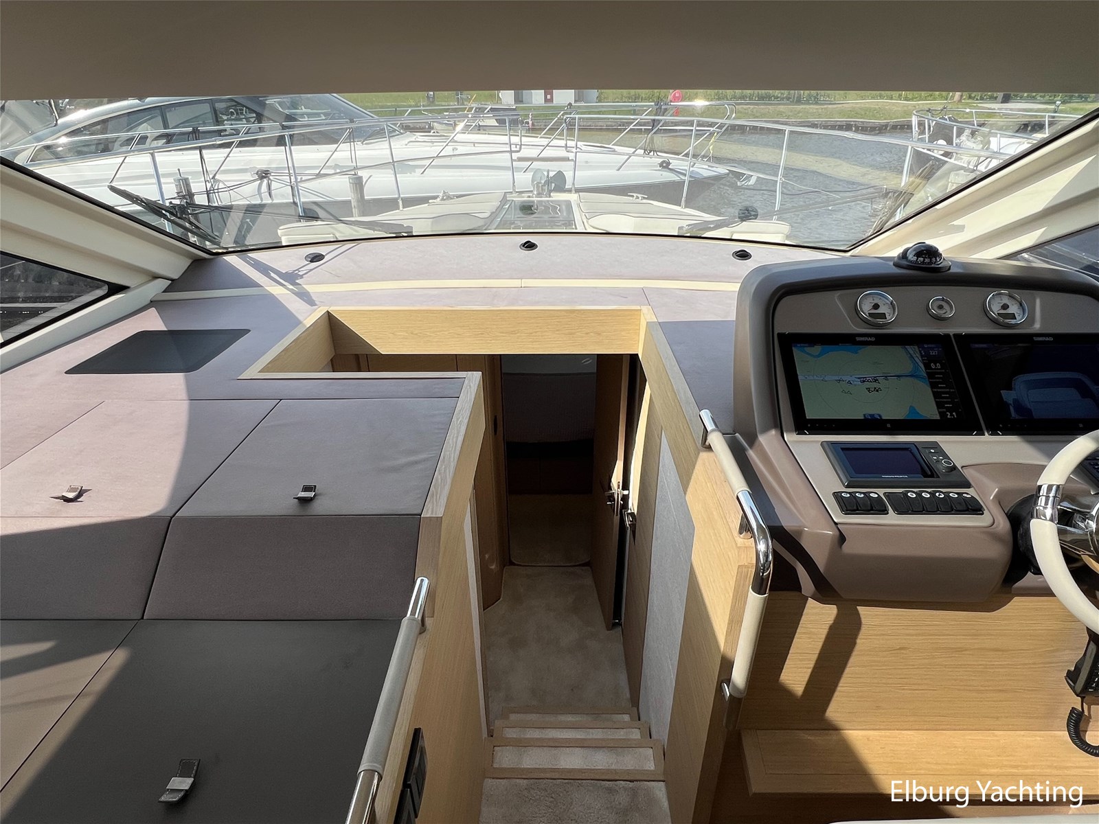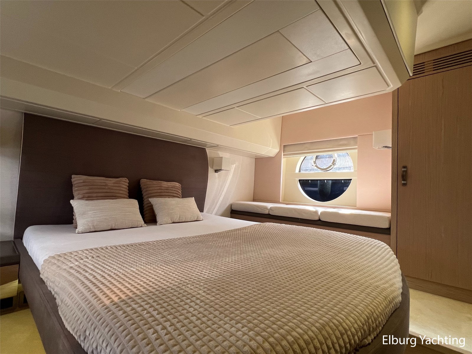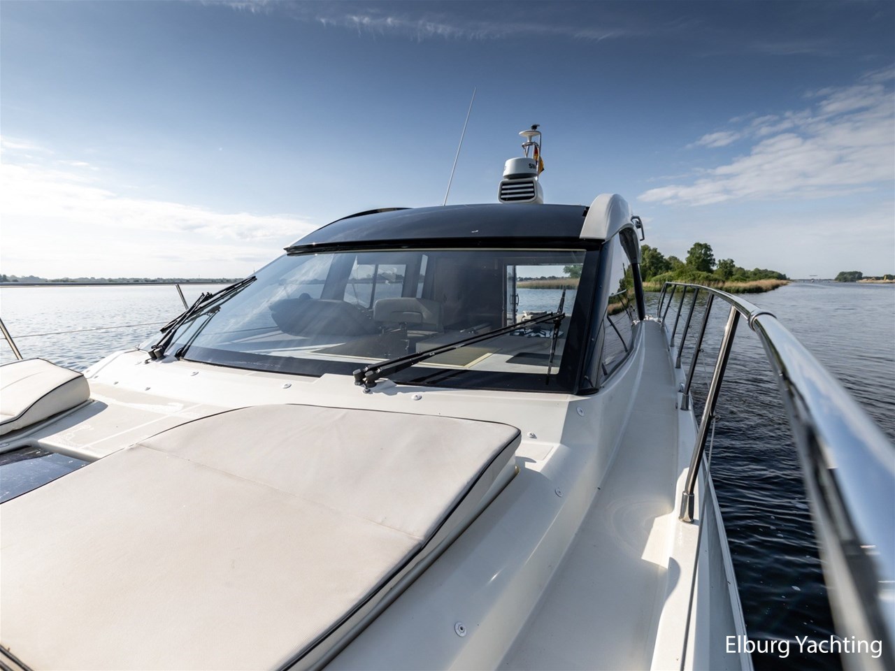 Zeer compleet uitgevoerde Monte Carlo 5S. De 5S-serie onderscheidt zich door stoere en sportieve looks en een hardtop met een buitenlounge op het dak. Vanaf het hydraulisch beweegbare zwemplateau wordt de open kuip betreden. De kuip heeft een geïntegreerde bank met bijbehorende kussens en vaste tafel. Aan SB zijde in de kuip bevindt zich de toegang tot de extra hut (crew cabin) in het achterschip, deze hut is tevens te gebruiken als extra opbergruimte. Via de open kuip stap je eenvoudig op naar het gangboord met goede houvast rondom voor een veilige loop over het dek. Op het voordek zijn twee geïntegreerde klapbare zonnebedden aanwezig. Via een geïntegreerde trap vanuit de kuip betreed je de buitenlounge op het dak. Deze buitenlounge heeft een in hoogte verstelbare tafel waarmee er ook een groot zonnebed gecreëerd kan worden. De salon en de kuip laten zich verbinden door drie grote glazen wegklapbare deuren. De kombuis is gesitueerd bij de ingang van de salon. Door het openen van de salondeuren wordt de kombuis volledig betrokken bij de kuip. De salon gecombineerd met de stuurstand bevindt zich op dekniveau. Via de de grote ramen rondom (getint) is er goed zicht en komt er veel licht binnen. Het buitengevoel naar binnen brengen kan door het openen van het grote elektrisch bedienbare schuifdak en twee zijruiten. Benedendeks bevinden zich drie hutten voor in totaal zes personen. De 2-persoons eigenaarshut bevindt zich midscheeps over de volledige breedte van het schip. Deze hut is voorzien van eigen sanitair en-suite. Aan stuurboordzijde bevindt zich een 1 x 2 persoons stapelbed en in de voorhut een 2-persoons Frans bed. Centraal is er een tweede badkamer met douche en toilet gesitueerd. Deze Monte Carlo 5S is verder voorzien van: achteruitkijk camera via plotterscherm, elektrisch bedienbare gangway, kuip afsluitbaar met deur naar zwemplateau, TV op lift in salon, Volvo ship/motormanagement display bij stuurstand, Fusion audiosysteem, trimtabs, Yachtcontroller afstandsbediening om te manoeuvreren middels de IPS aandrijving + boegschroef.