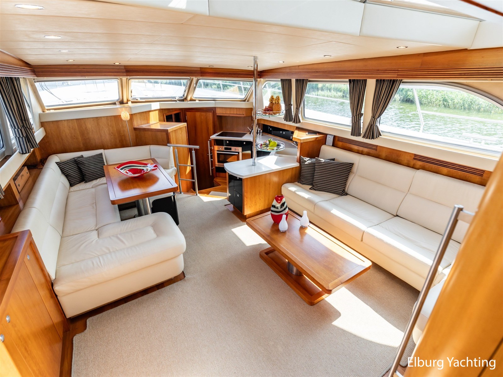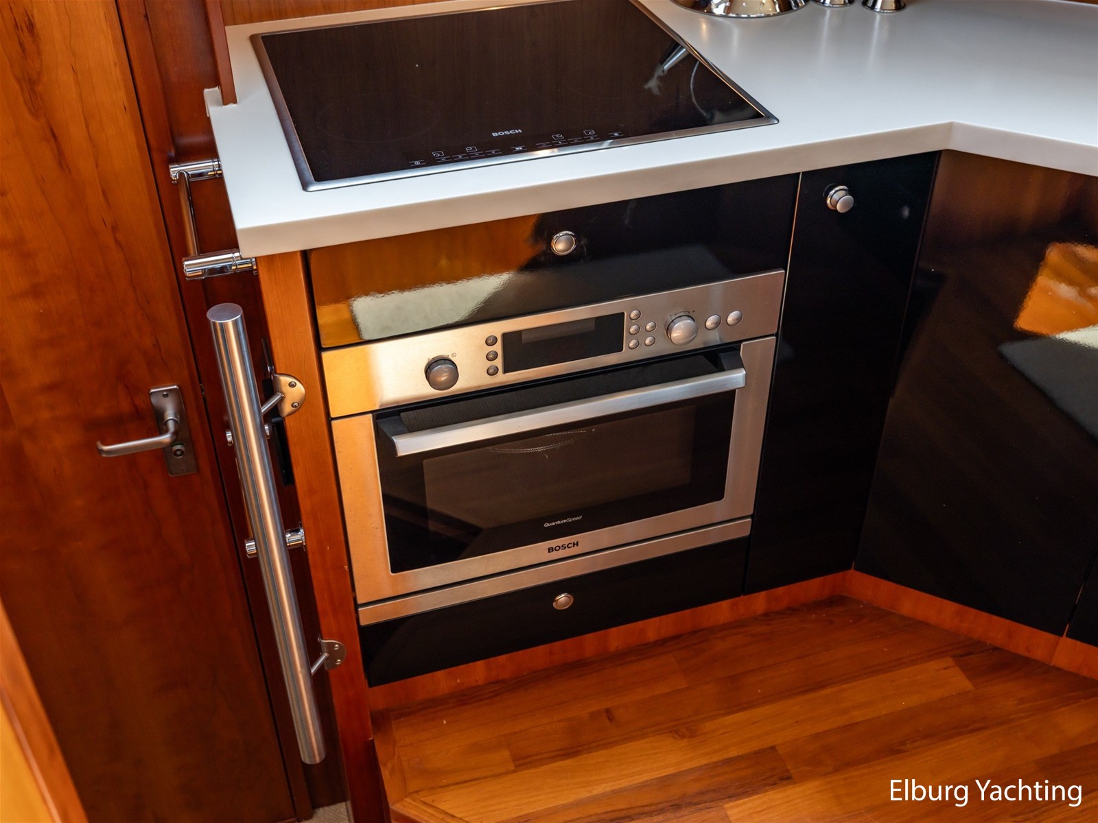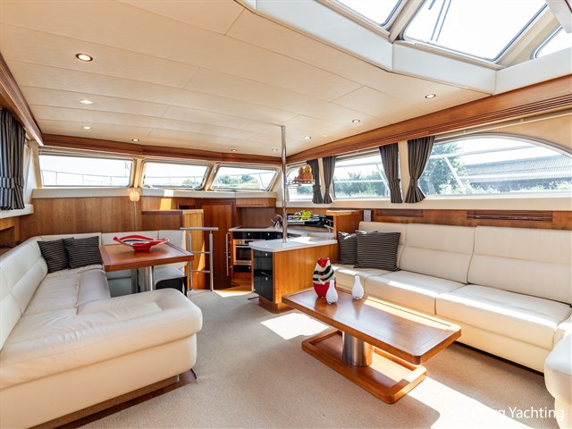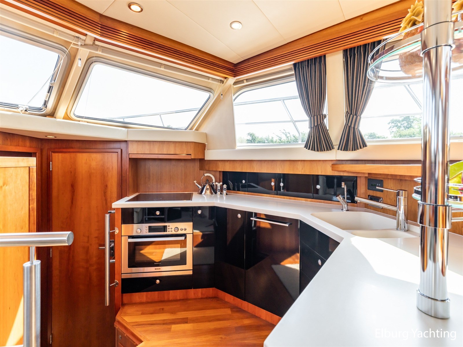 Vanuit de stuurhut loopt u via een niveauverschil naar de ruime salon, uitgevoerd in teak met crème-witte lederen bekleding en royale lichtinval dankzij de grote ramen. Aansluitend bevindt zich, een niveau lager, de volledig uitgeruste kombuis. Deze keuken is voorzien van een Corian werkblad, keramische kookplaat, afzuigkap, Bosch oven, combimagnetron en dubbele koelkast. Alles is aanwezig om aan boord volwaardig te kunnen koken en leven.