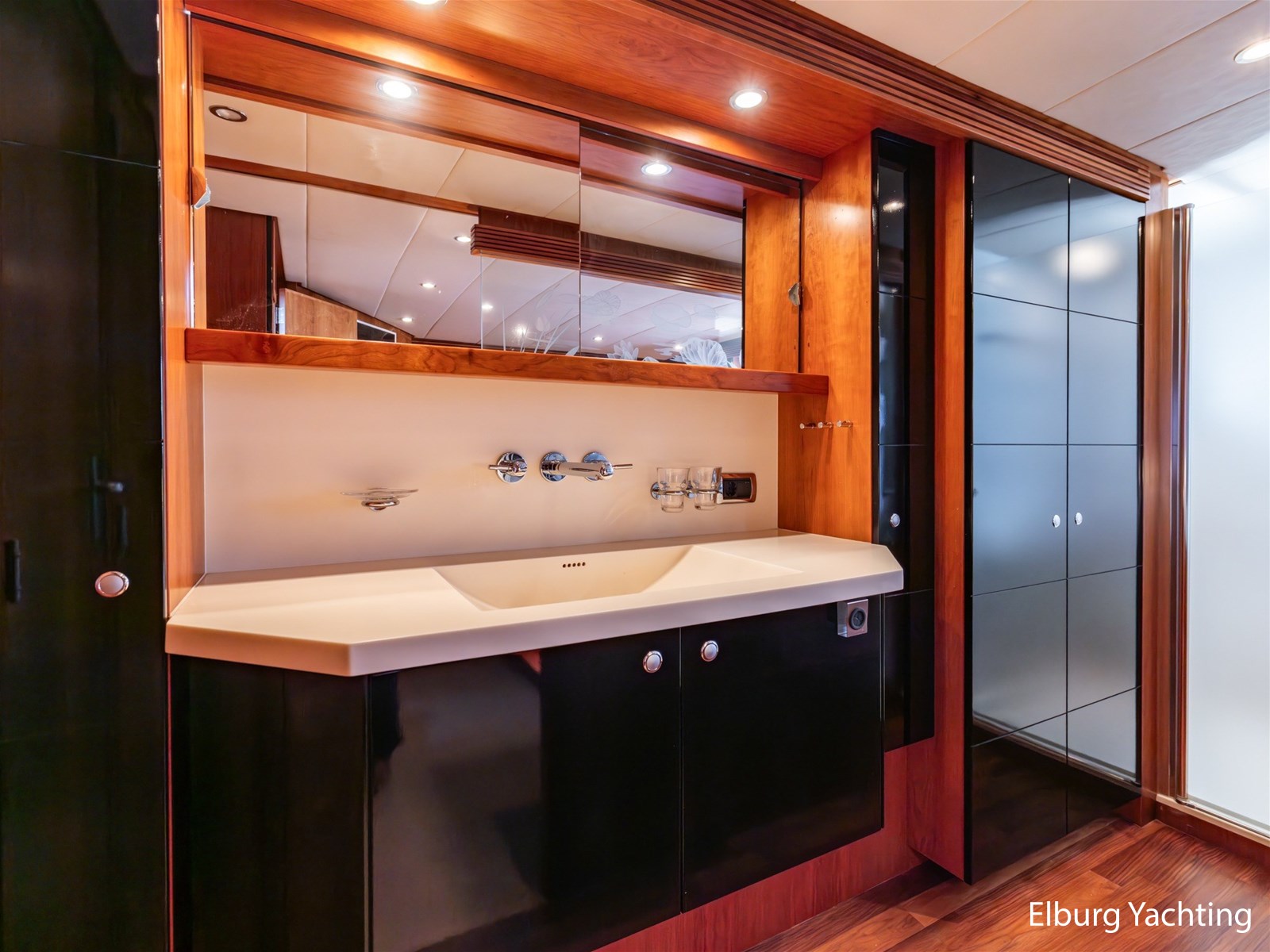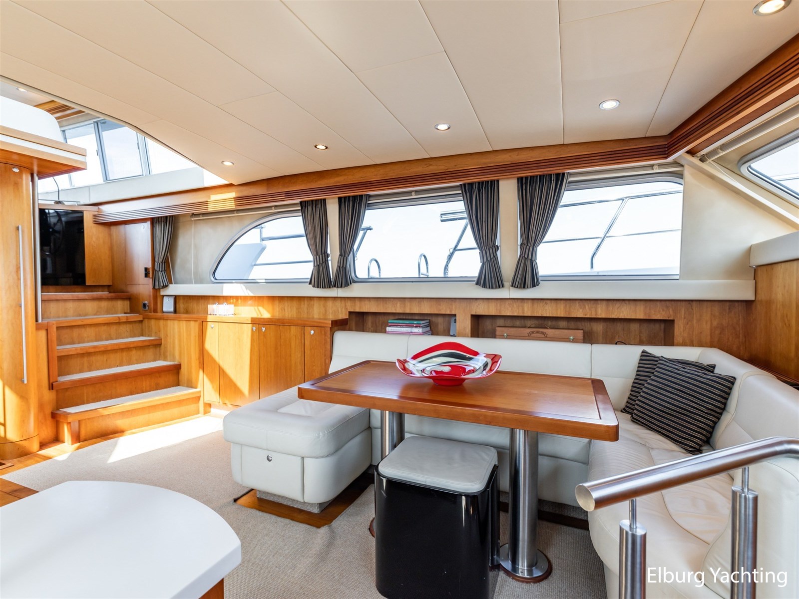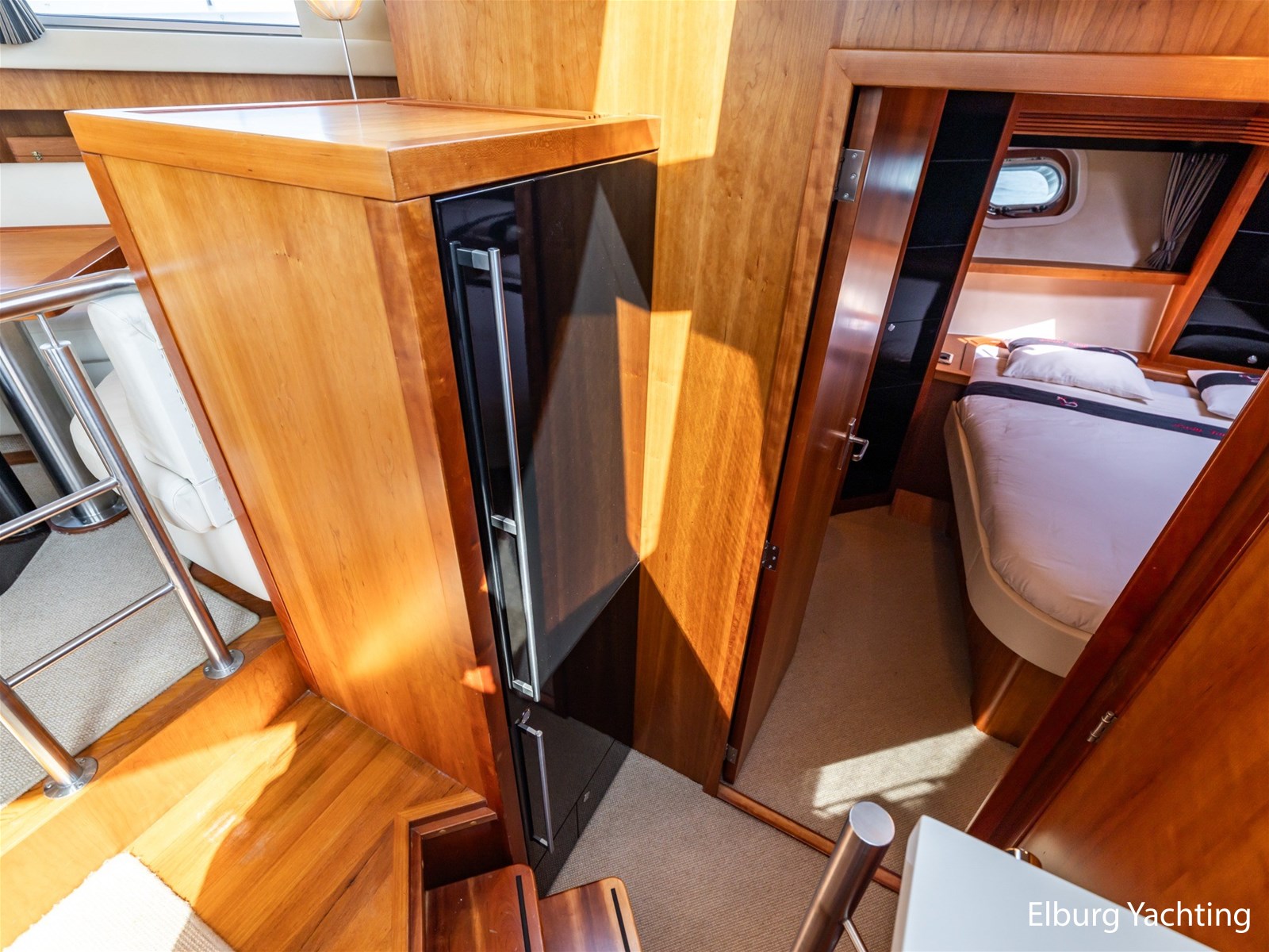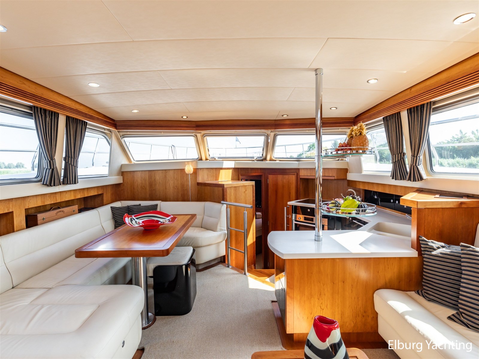 Vanuit de stuurhut loopt u via een niveauverschil naar de ruime salon, uitgevoerd in teak met crème-witte lederen bekleding en royale lichtinval dankzij de grote ramen. Aansluitend bevindt zich, een niveau lager, de volledig uitgeruste kombuis. Deze keuken is voorzien van een Corian werkblad, keramische kookplaat, afzuigkap, Bosch oven, combimagnetron en dubbele koelkast. Alles is aanwezig om aan boord volwaardig te kunnen koken en leven.