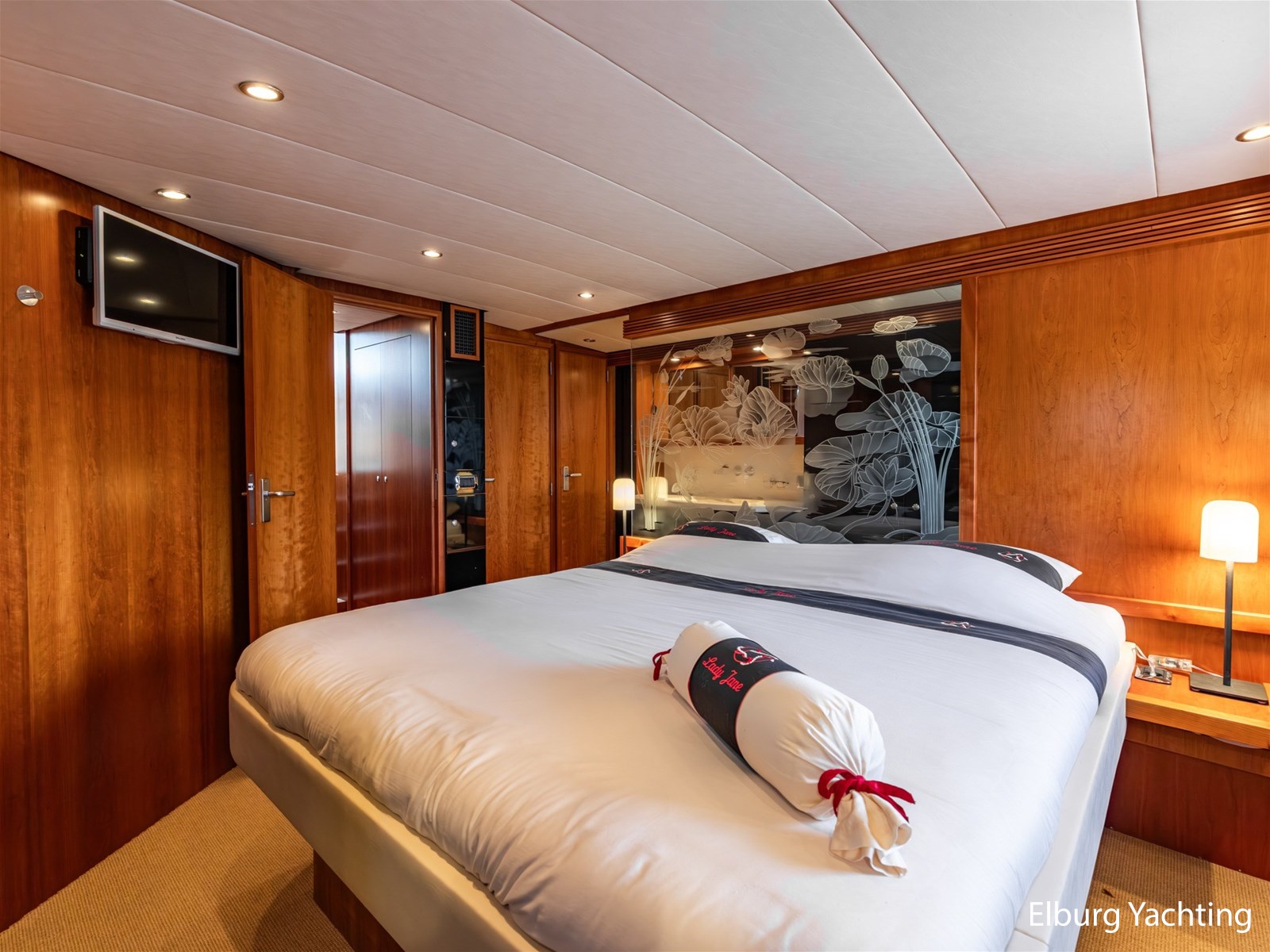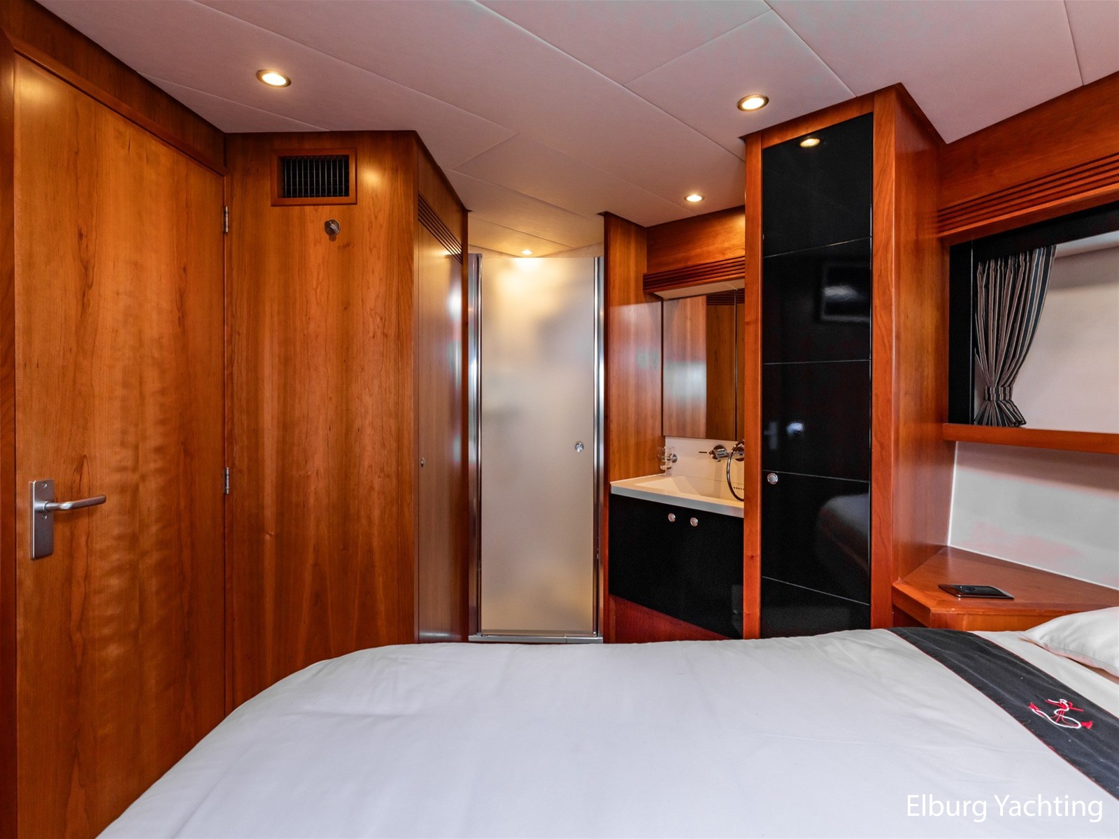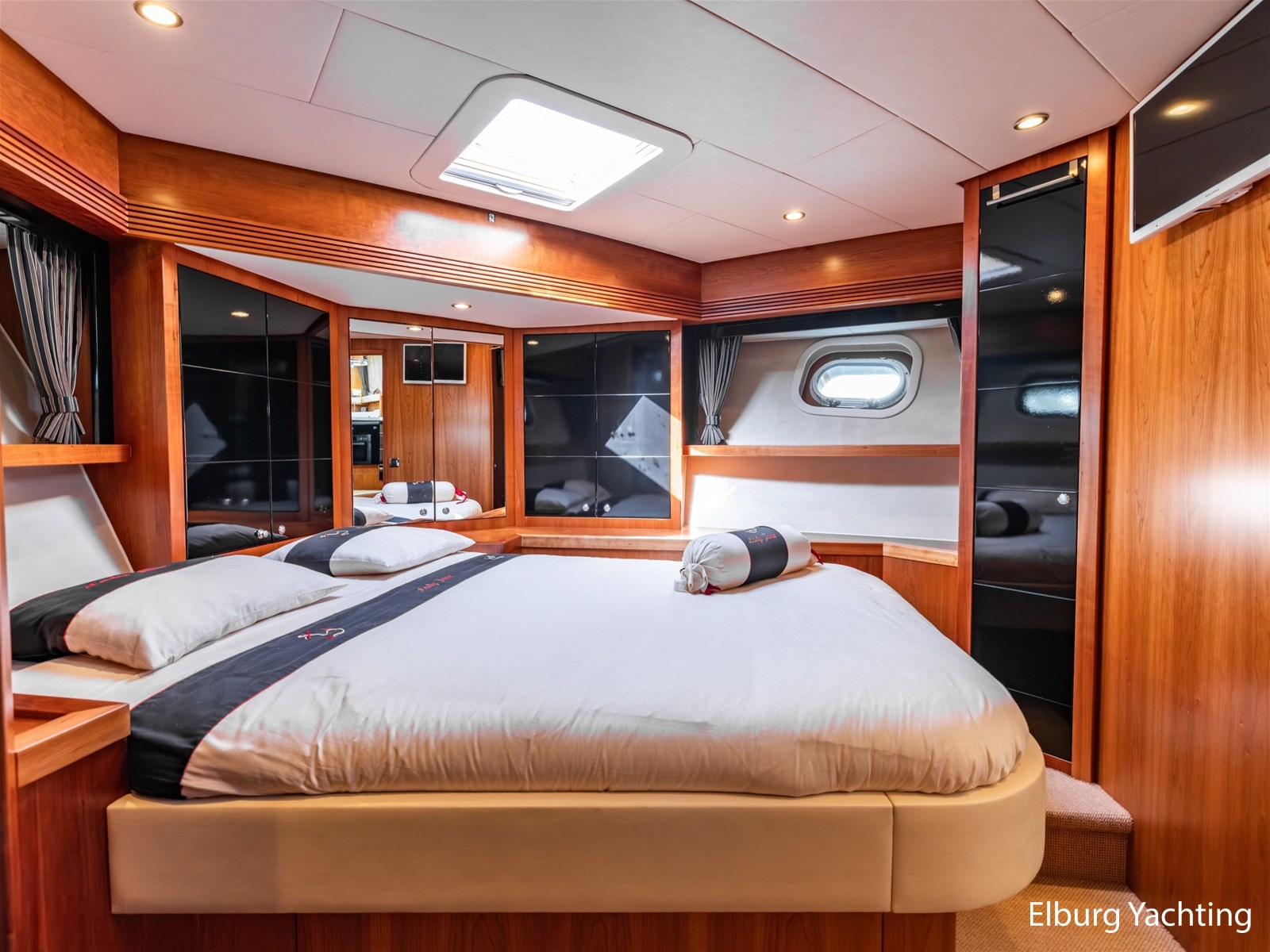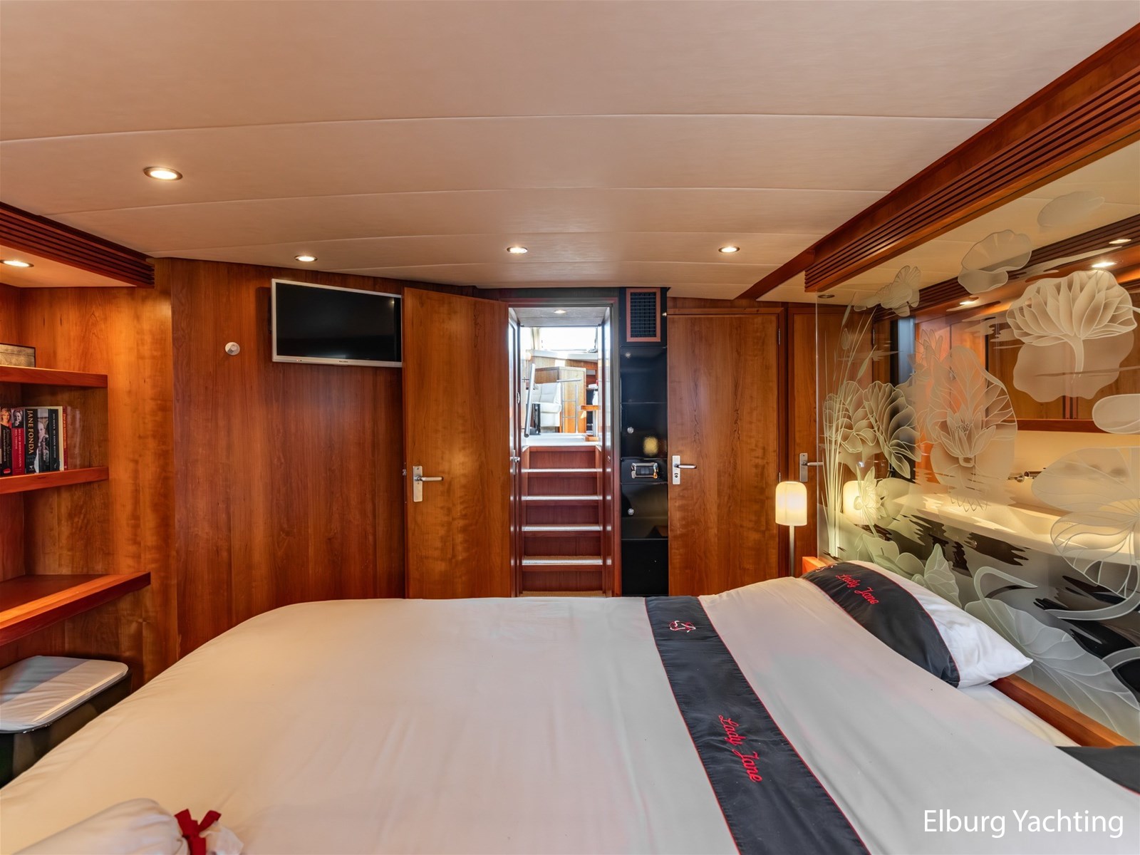 De eigenaarshut achterin is bijzonder royaal en beslaat de volle breedte van het schip. Deze luxe 'full beam' master cabin beschikt over een vrijstaand tweepersoonsbed, een badkamer en suite, ruime kastopstelling en een sfeervolle afwerking.