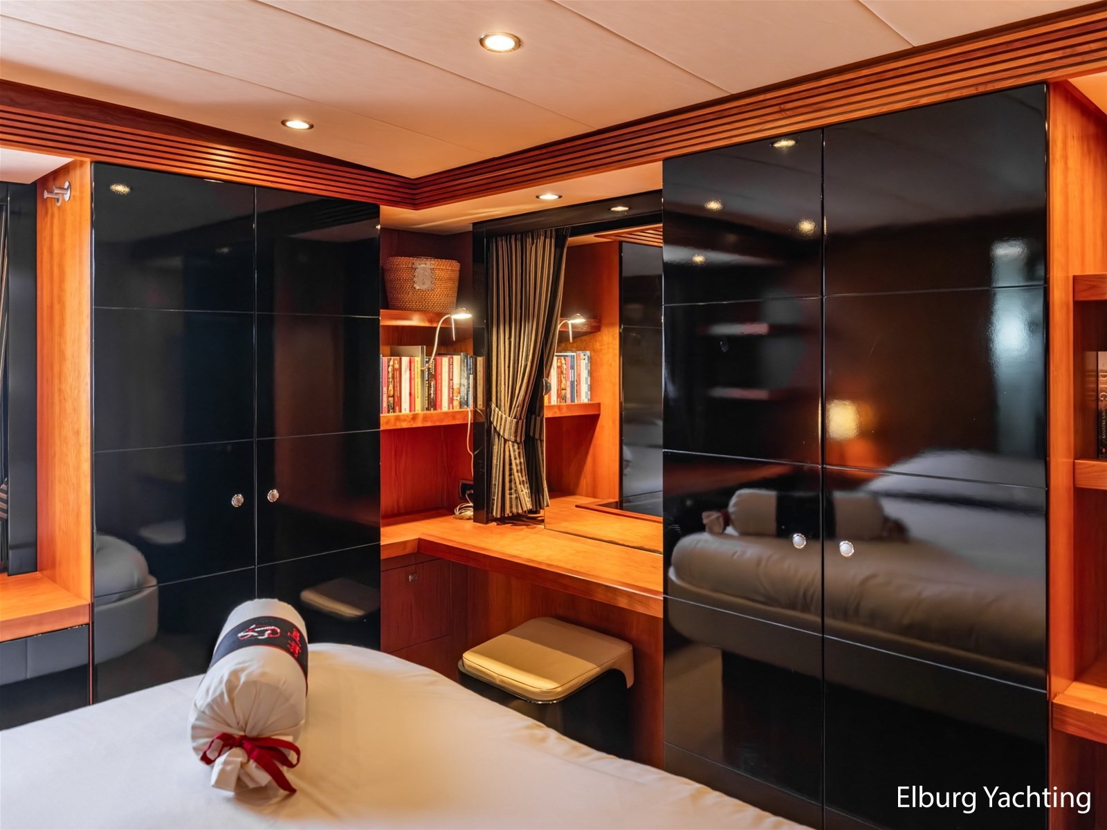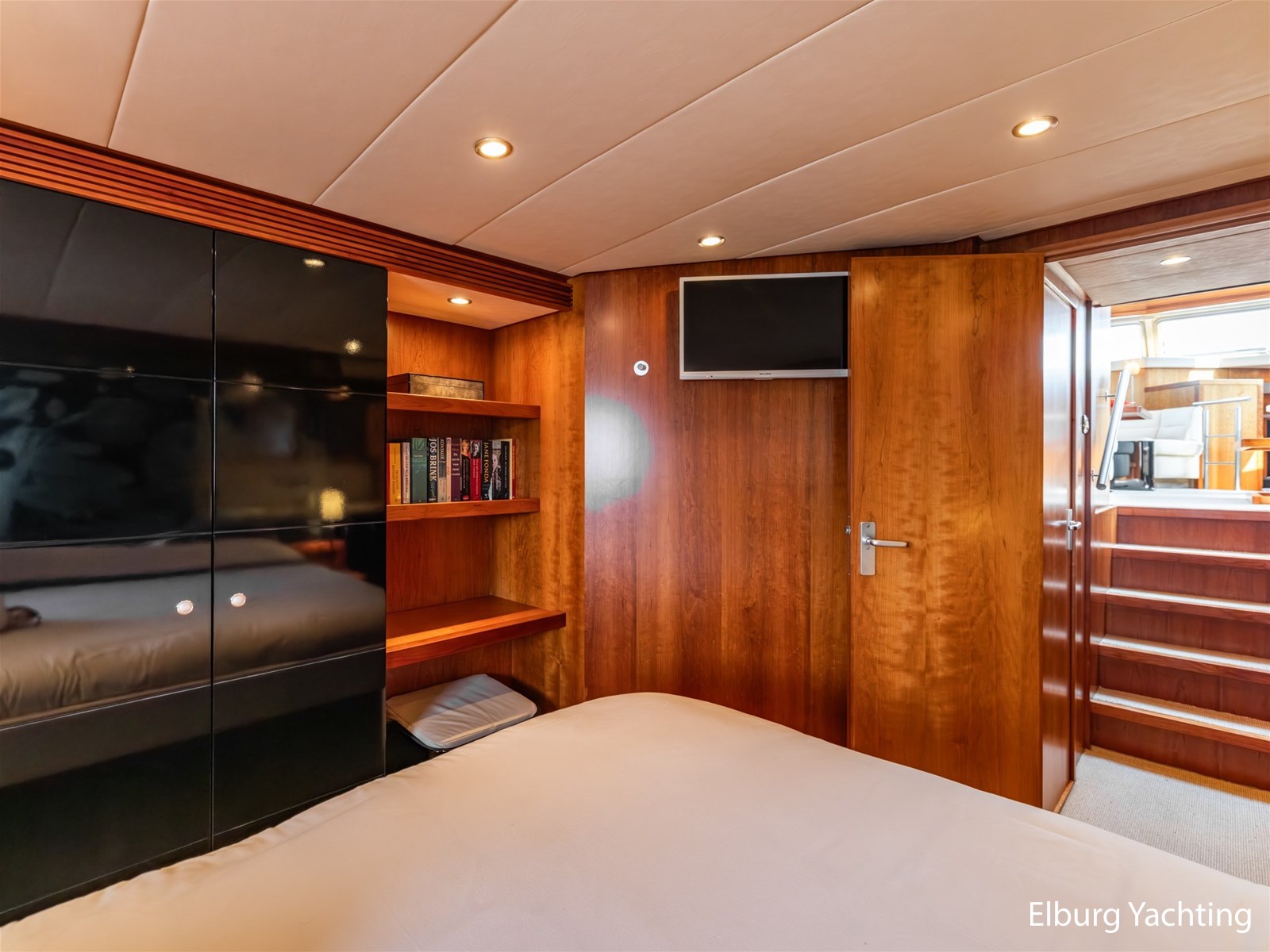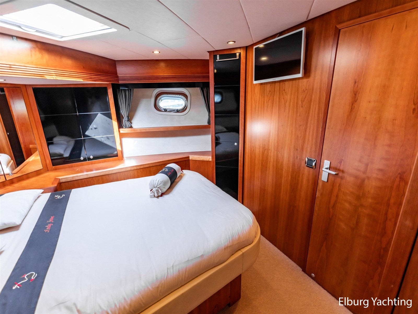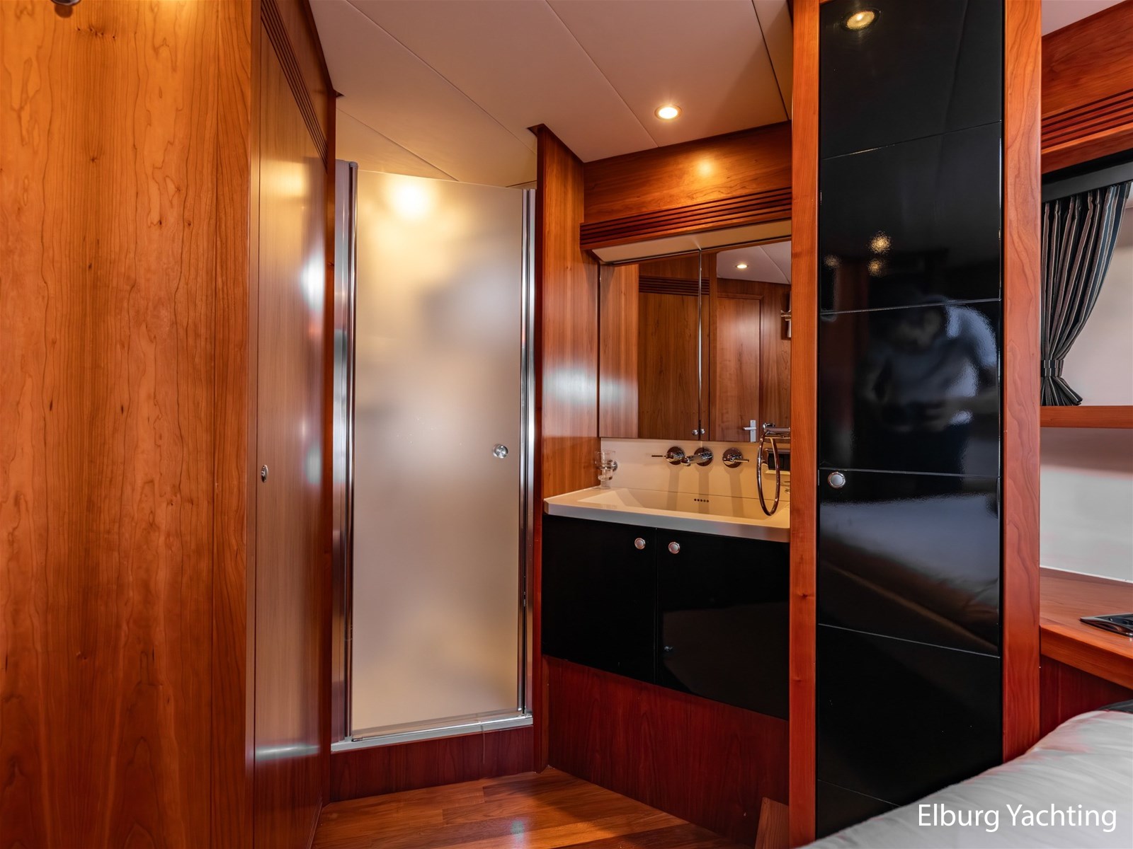 De eigenaarshut achterin is bijzonder royaal en beslaat de volle breedte van het schip. Deze luxe 'full beam' master cabin beschikt over een vrijstaand tweepersoonsbed, een badkamer en suite, ruime kastopstelling en een sfeervolle afwerking.